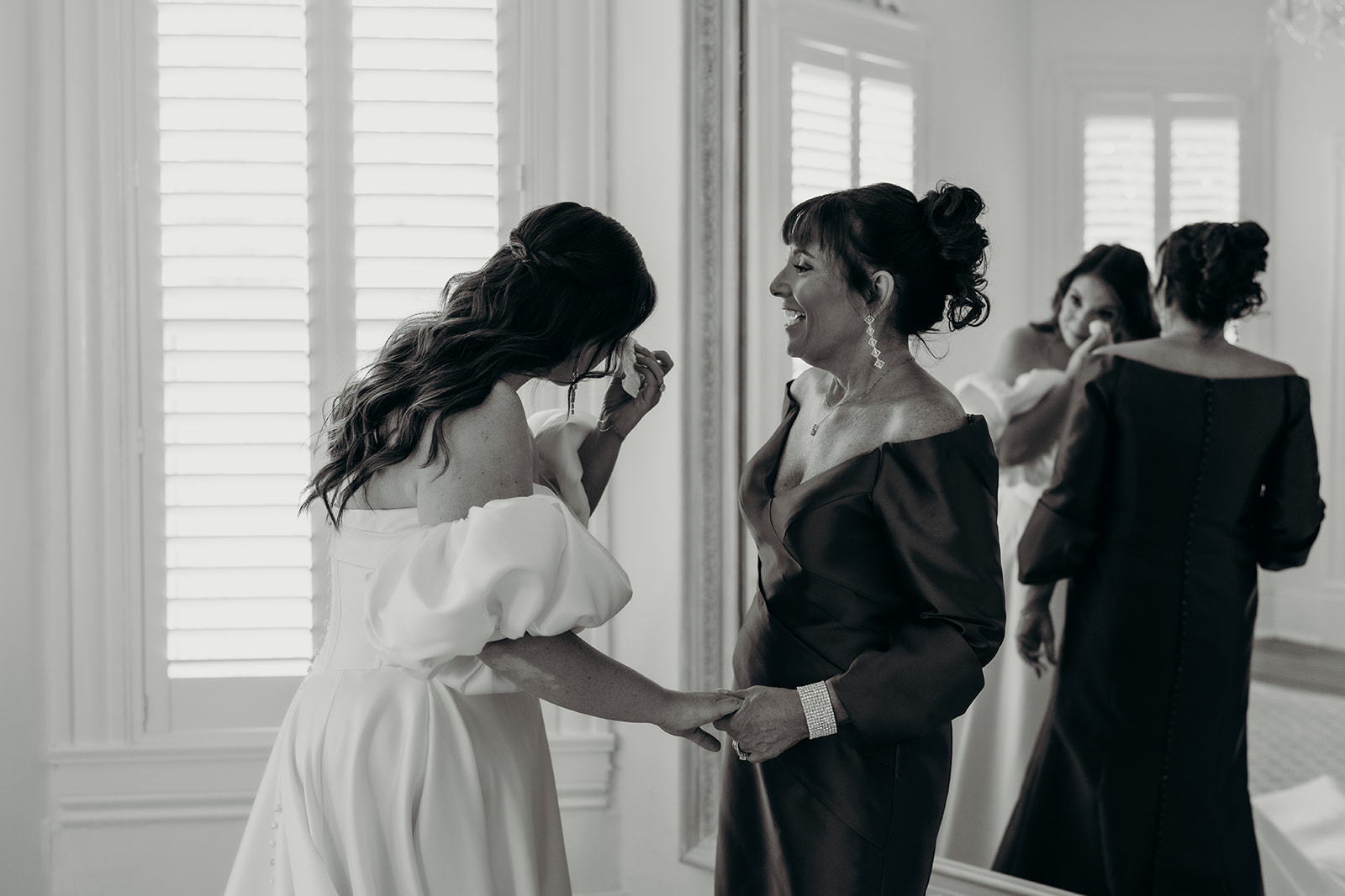 The wedding day began with the bride and her squad upstairs in the expansive bridal suite. Bathed in beautiful natural light and complete with a large mirror perfect for getting-dressed shots, it was the ideal space for wedding-morning photos. The moment her mom helped her into her gown was filled with emotion, and the tears when the dress went on made for some of the most heartfelt getting-ready images of the day.
