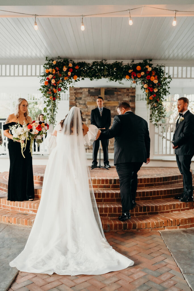The ceremony took place in the venue’s charming covered outdoor pavilion: a versatile open-air space just steps from both the reception area and main house. Surrounded by friends and family, the couple said “I do” in a moment filled with joy and meaning. One of the most memorable highlights was the bride’s mom walking her down the aisle before she joined her partner at the altar.
